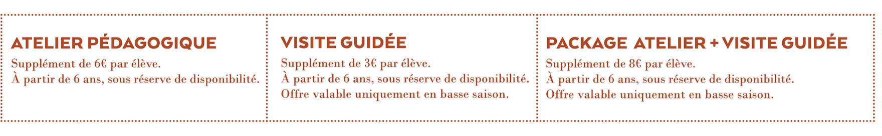 | ATELIER PÉDAGOGIQUE AVEC SUPPLÉMENT DE 6 EUROS PAR ENFANT (à partir de 6 ans). Retrouvez nos offres scolaires sur la plateforme Adage. |